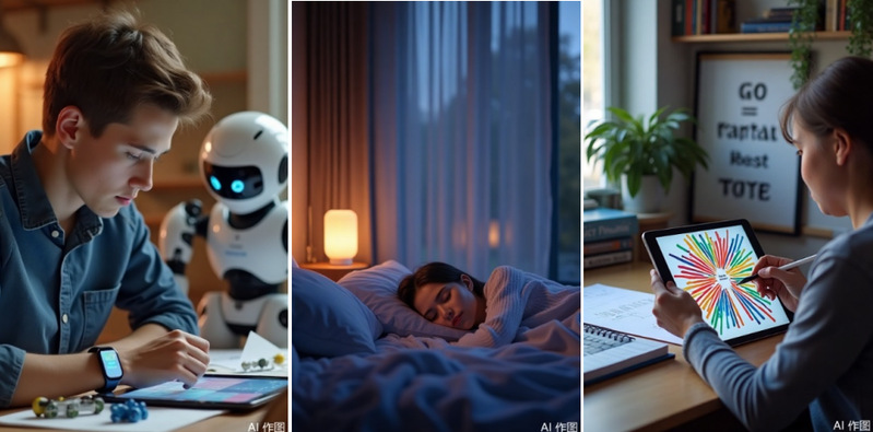 (1)MidJourney和豆包:生成4张AI绘画,通过关键词“大学生、熬夜、脾主四肢、五行调和、体重指数可视化”调整画面细节。