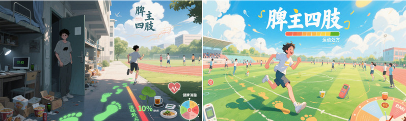 本系列作品以从宿舍到操场的健康蜕变之路为核心意象,结合卫生管理中三级预防理念,展现当代大学生通过科学运动与中医养生实现身心调适的全过程。画面以色彩渐变象征身心转变——主人公从宿舍(灰暗色调、外卖堆积、熬夜状态)出发,沿途经过计步器、中药代茶饮(荷叶决明子茶)、BMI健康转盘等互动元素,最终走向阳光操场(明亮色调、活力运动场景)。地面“运动处方”脚印进度条记录改变历程,天空云朵巧妙构成“脾主四肢”篆体字,呼应中医“脾胃为后天之本”的理论,强调运动与饮食调养对健康体重的协同作用。