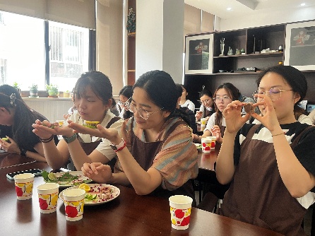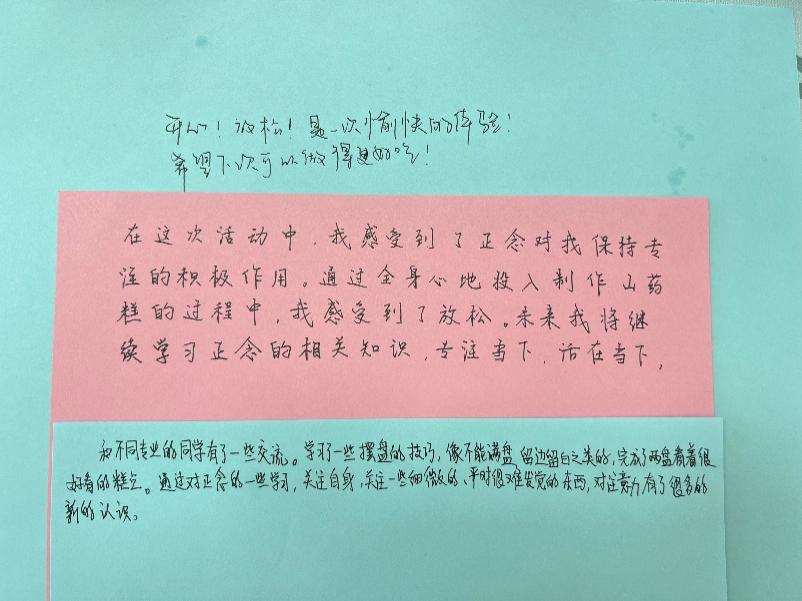 在“正念饮食”环节,老师引导同学们调动所有感官:欣赏糕点源于自然的色泽与形态;深深吸气,辨识融合了米香、药香与花香的复合层次;感受糕体温润弹性的触感;最后小口品尝,让舌尖细细体会谷物清甜、茯苓微甘、山药粉糯、玫瑰馥郁在口腔中层层释放的美妙过程。此刻药膳成为连接感官、滋养身心、体悟“药食同源”精妙的桥梁。同学们专注品味的姿态和满足的微笑,正是中医药膳文化魅力与正念觉知力量完美交融的最佳注脚。