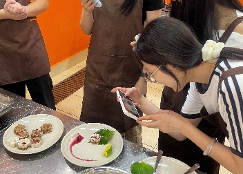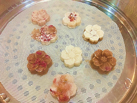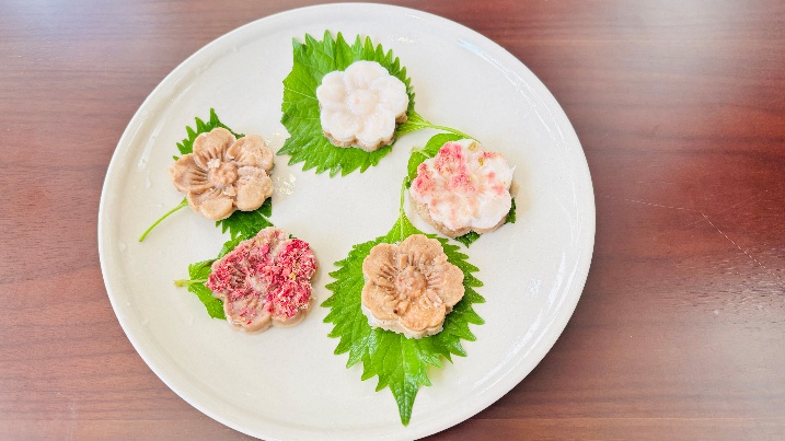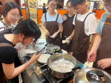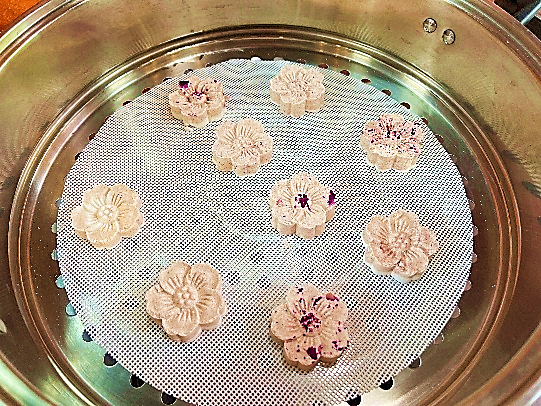 掀开蒸笼,雾气氤氲中,莹润如玉、粉白相间的玫瑰山药茯苓糕惊艳呈现,散发出谷物醇香与玫瑰、茯苓、山药特有的自然芬芳。冷却定型后,同学们发挥自己的想象力进行创意摆盘。