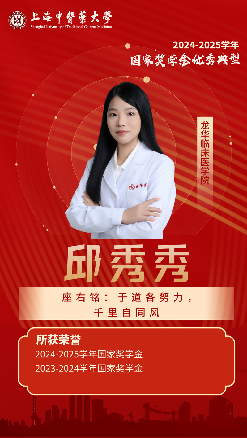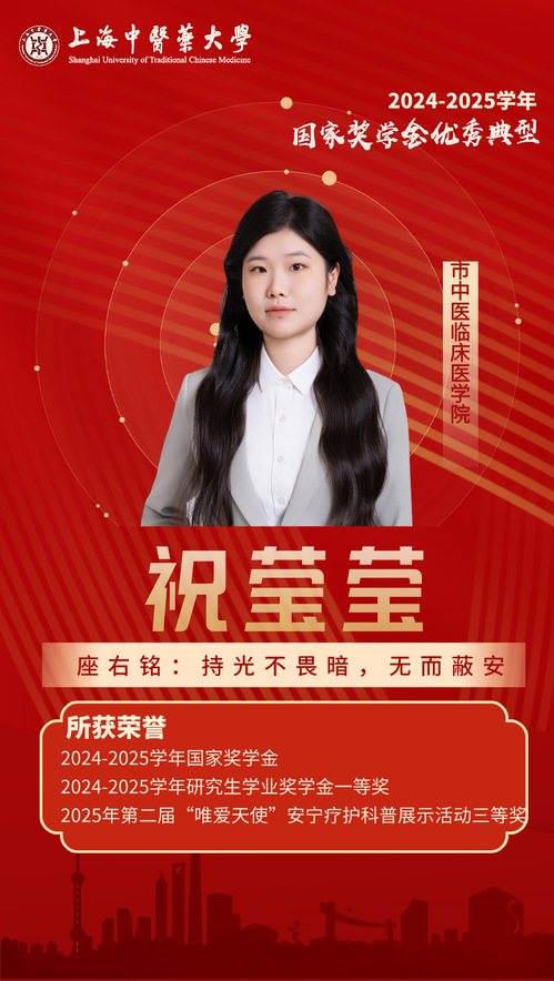 她始终以高标准严格要求自己,思想上积极追求进步,具有较强的社会责任感。工作中,她以身作则,发挥模范带头作用,团结同学并热心服务集体,在其带领下,所在班级获评校先进班集体称号荣誉。她累计志愿服务时长超过50小时,先后获“优秀团干部”“优秀学生”等荣誉称号。在专业学习与科学研究方面,她勤奋刻苦,勇于探索,曾获得研究生学业奖学金一等奖、国家奖学金,已在核心期刊及SCI收录期刊上发表多篇学术论文,具良好的学术素养与创新能力。未来,她将以坚韧不拔的品格诠释奋斗精神,展现新时代中医青年锐意进取的蓬勃姿态。