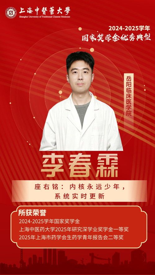他坚定理想信念,锚定报国航向,将个人学术追求融入“健康中国”战略与中医药振兴大局。他专注于代谢相关脂肪性肝病这一高发慢病研究,在导师团队指导下,围绕疾病分型、评估与干预潜心钻研,积极参与临床试验与专病队列建设,探索中西医结合诊疗路径,助力中医药从“经验优势”迈向“证据优势”。他以第一作者或共同第一作者身份发表SCI论文3篇(总IF>25),并在国际会议上为推动中医药国际化积极发声。作为团支书,他将思想引领融入中医药实践,策划“青春启航”系列团日活动,推动红色教育、中医药传承与科研创新同向发力、协同共进,带领团支部获评校“五四红旗团支部”“活力团支部”。他怀抱梦想,脚踏实地,展现了新时代中医青年的精神风貌与责任担当。