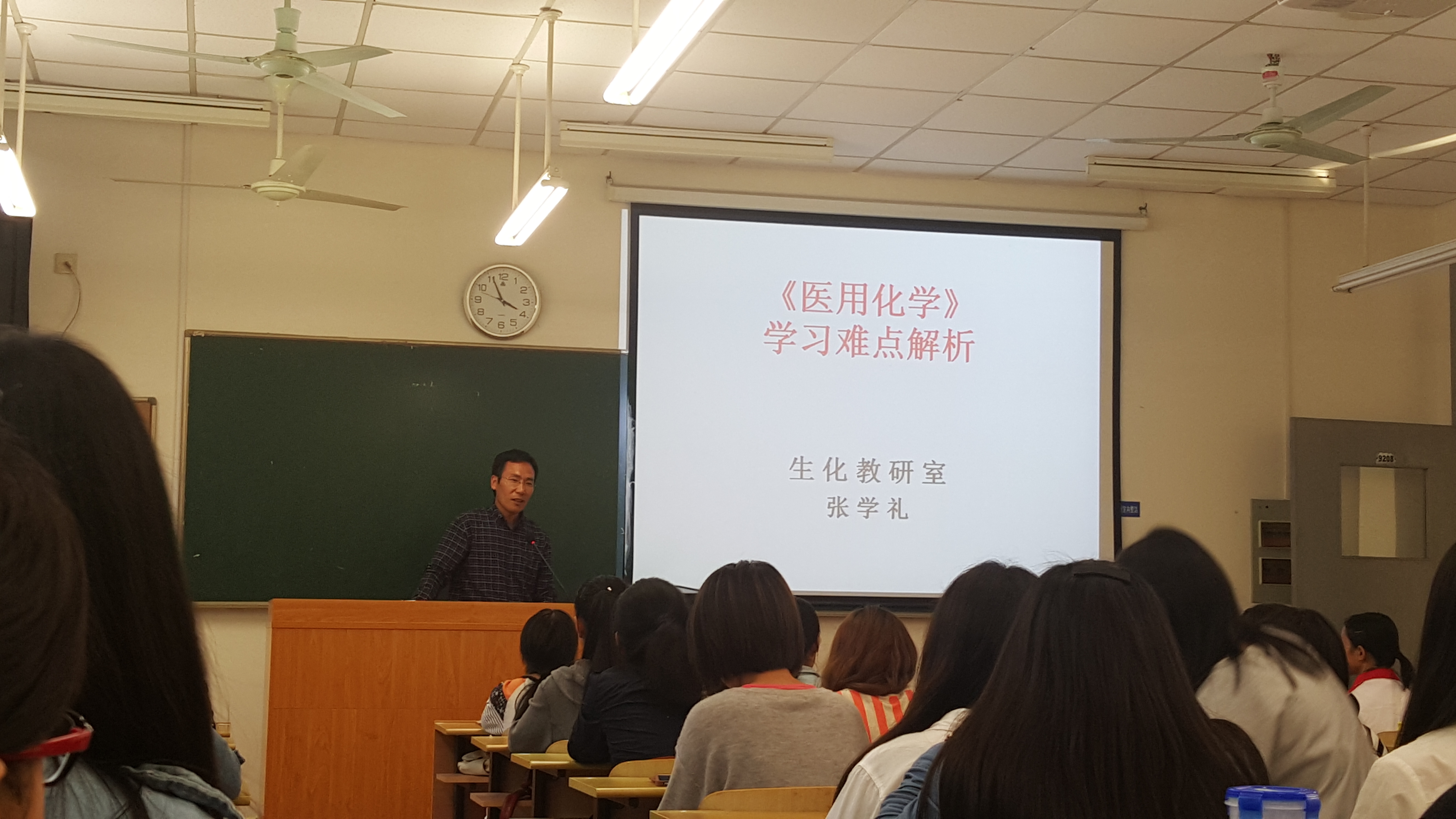 10月20日下午四点,上海中医药大学生化教研室副教授、上海市生物化学与分子生物学学会理事生化教研室常务副主任张学礼教授在9208教室给护理学院的同学做了一场有关“医用化学学习难点解析”的讲座,讲座内容是根据学生需要而选取的,所以张教授的讲座座无虚席!