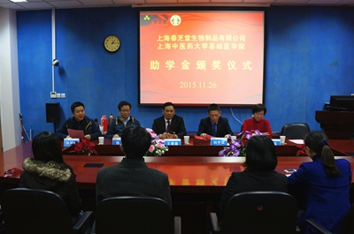2015年11月26日,基础医学院2015年“春芝堂”助学金颁奖大会在我校举行,出席大会的有春芝堂集团党总支书记、总裁王爱庭,总裁助理孙溢,春芝堂商学院院长李洪青,副院长刘齐斌,企划中心总经理严勇,我校基础医学院院长陈晓以及获奖的12位优秀青年教师和30位学生。颁奖会由基础医学院党委副书记孙鸿杰主持。