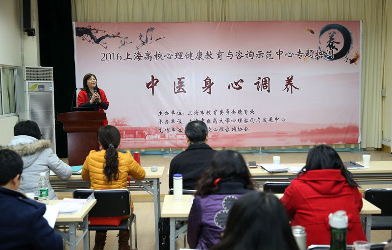 2016年1月4日晨,由上海市教委德育处主办、上海中医药大学心理咨询与发展中心承办的“中医身心调养”专题培训在上海中医药大学图书馆底楼111室成功拉开序幕。上海中医药大学党委副书记、上海市中西医结合学会伦理医学专业委员会主任朱惠蓉、上海中医药大学中医心理专家委员会首席专家、终身教授王庆其、学工部部长、高校心理咨询协会副理事长陶思亮出席了本次开班仪式。此次开班仪式由心理咨询与发展中心教师谌誉主持。