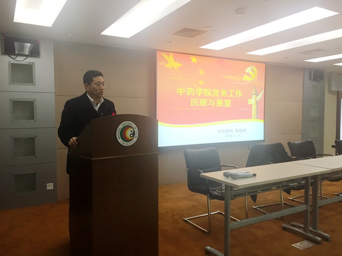 本次大会首先由李医明书记作中药学院党总支工作回顾与展望。李书记首先从我党的指导思想谈起,对中药学院党总支的组成、党员发展情况做了具体的介绍,其次谈到中药学院党总支在过去一年来的特色工作,尤其是在2014、2015年连续两年被评选为“上海中医药大学服务型党组织建设优秀案例”,最后李书记也谈到目前中药学院党总支存在的不足,以及相应的改进方法,并对未来工作进行了展望,表示继续加强建设服务型党组织。