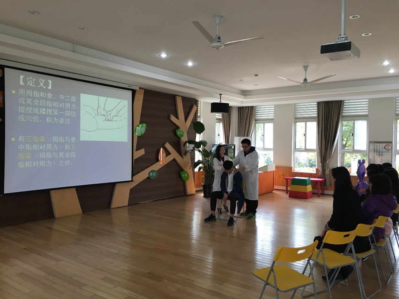 契合学雷锋日,立足大学周边,利用专业特长,2016年3月3日下午,我院科学商店的志愿者们,来到张江经典幼儿园,开展推拿手法和中医养生保健知识宣讲,并为老师们提供推拿和义诊服务。