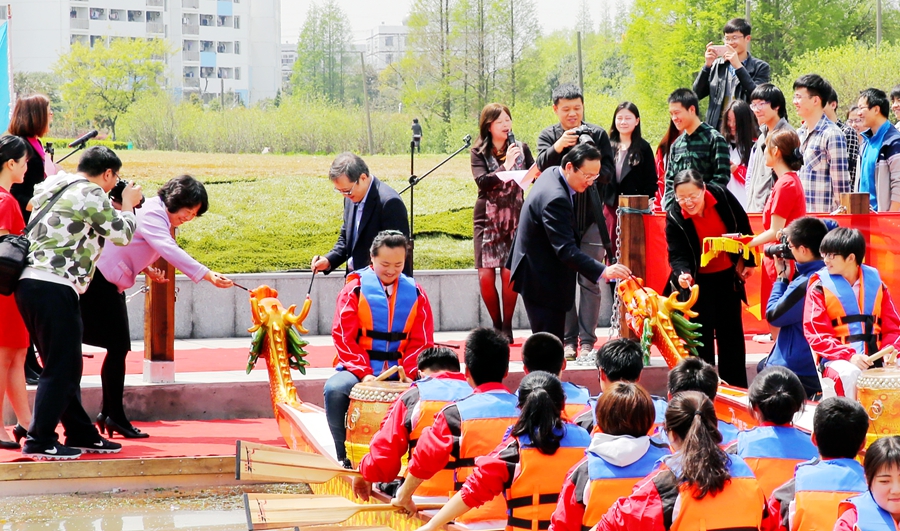 校领导和师生代表首先来到了新落成的龙舟训练基地。朱惠蓉向在场师生介绍了基地的建设情况,并向参与建设的师生表示衷心的感谢。随后,张智强、徐建光、施建蓉、张瑾共同为龙舟点睛,表达师生对国家、社会和学校的美好祝愿。张智强在讲话中表示,学生事务与发展中心、龙舟训练基地、健身中心是学校在六十华诞之际送给全校师生的礼物。这三个工程的启用,标志着我校教育事业向着“立德树人”的目标又进一步,这是一件让人欢欣振奋的事情。同时,他勉励全校师生继承龙舟所体现的民族悠久历史文化和精诚合作的集体主义精神。之后,徐建光宣布龙舟基地正式启用。在师生们的一片加油声中,两艘龙舟你追我赶,破浪前行。