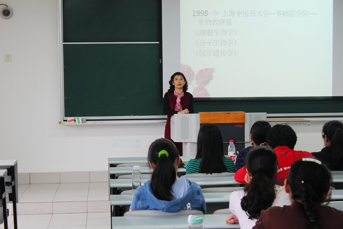 2016年4月20日下午14:00,基础医学院生物学教研室主任、第五导师团导师王晓玲教授受邀来华东师范大学闵行校区开展讲座。讲座主题为“《生物化学》与中医研究——科研思路与方法”。辅导员何璠担任主持,60名中医临床八年制学生在场认真倾听。
