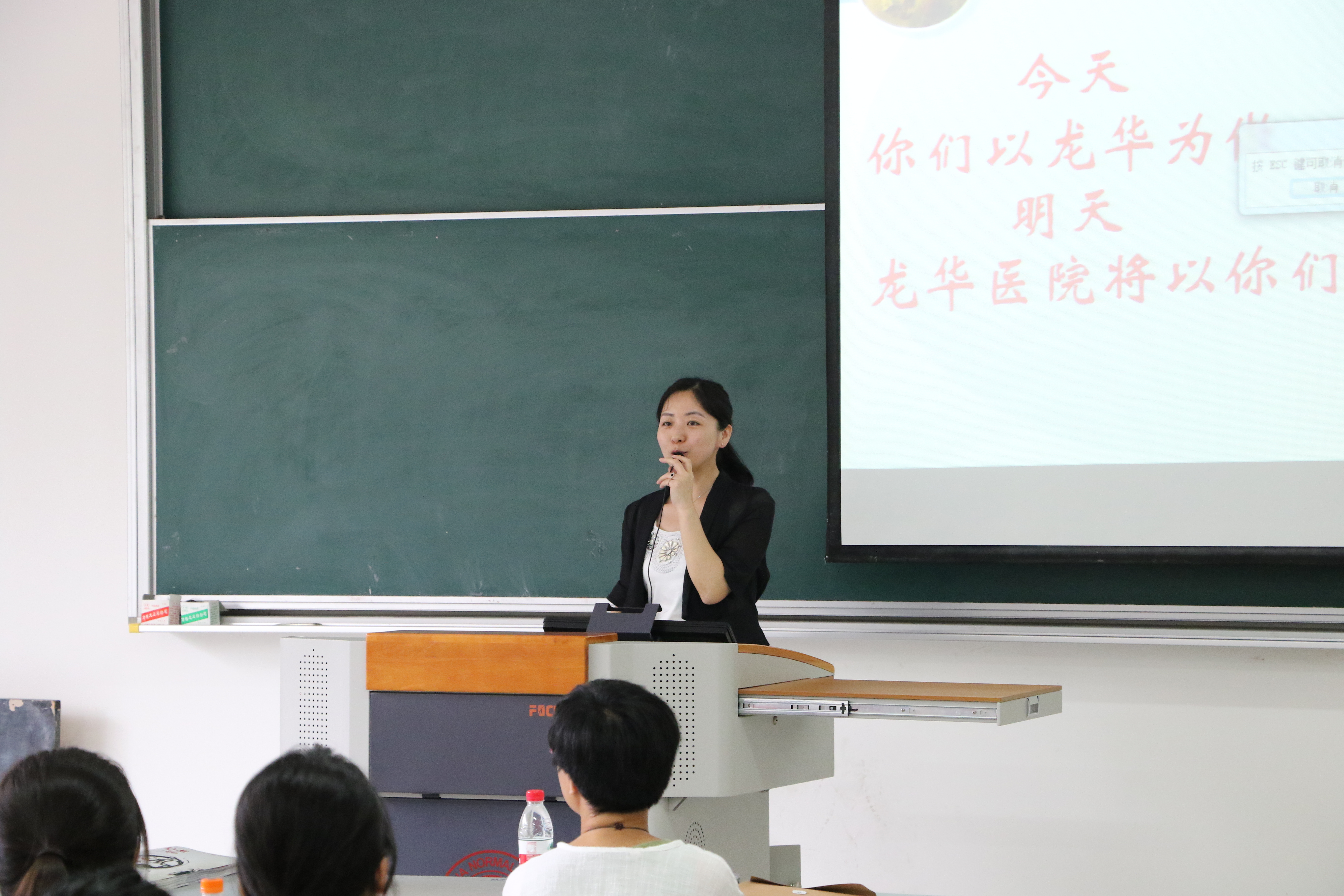 2016年6月15日下午13:30,龙华医院教学处副处长薛轶燕、教学处徐丽、09级中医临床七年制学生受邀来华师大闵行校区,给2014级中医学七年制和2015级中医八年制学生进行交流。首先由负责学生工作的薛老师介绍龙华医院的概况。她分别介绍了医院的地理位置、医院概况、重点学科等。其中她谈到龙华医院的重点专科,有中医外科、肿瘤科、骨伤科等等。她还强调了龙华医院的独特之处,地处市中心,毗邻肿瘤医院、第六人民医院等西医医院,但还是坚持以中医为立院之本。院内“建院八老”的雕像,体现龙华医院秉承名老中医传承模式。龙华医院有上海市名中医21位,名中医工作室31个,在内外妇儿等科均有优势,通过名医讲堂等传承模式来发展中医学。薛老师强调龙华医院在名中医传承方面走在前列。医院依托名医传承,比如说教学也是通过名老中医的言传身教来培育数代青年学子,以立德树人为核心思想。她讲到我们会在第五年接触到中医的临床基础课程,由此薛老师介绍了龙华医院的教学队伍和学生情况。龙华医院承担了研究生教学,住院医师规范化培和本科生教学。龙华医院的教育模式、专业情况、三级师资体系、教学特色等等都有所谈及。其中引发同学关注的是龙华医院非常注重学生临床思维的培养,比如说临床带教,以学生为主体,老师从旁观察指导,他们可以在临床实践中不断提高能力。在介绍的结尾,她展示了这样一句话——“今天,你们以龙华为傲;明天,龙华医院将以你们为傲!”