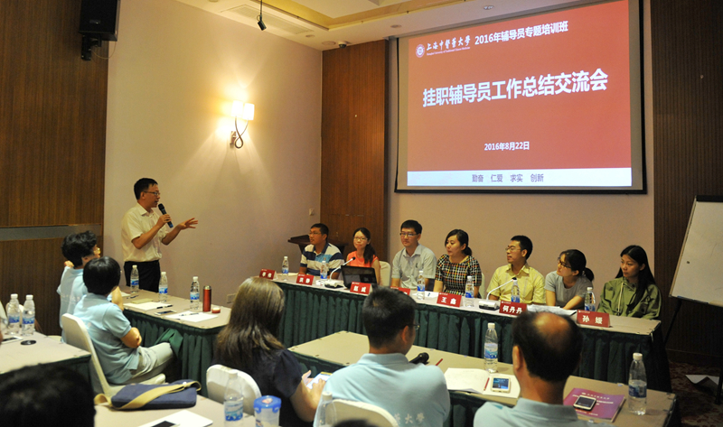 2016年8月22日晚,作为上海中医药大学2016年辅导员专题培训班的重要项目之一——挂职辅导员工作总结交流会在东方绿舟顺利召开。校党委副书记、副校长朱惠蓉、学工部部长陶思亮、研工部部长何江、各二级学院分管学生工作负责人以及全体辅导员等参加会议。会议由刘秋宏主持。
