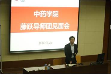 2016年10月26日下午,中药学院2016级中药班的全体同学与以中药学院院长徐宏喜老师做团长的藤跃导师团的导师们在6504进行了师生见面会。见面会上先由吕建萍老师介绍了藤跃导师团的基本情况、导师团的服务理念、宗旨、服务对象。藤跃导师团一共有11名导师,其中10名是在校教职工,1名是龙华医院药剂科主任。最后由导师团导师劳远至老师代表导师们发言,劳老师对大学的正确学习方法和学习要领做了简要的概述,提出了六点希望和要求:第一,每天控制玩手机、电脑、游戏的时间。第二,四年内掌握一门外语。第三,钻研一门课程。第四,培养一门兴趣爱好。第五,交一个知心朋友。第六,参与组织一次活动。劳老师的发言让同学们更加了解了大学学习的正确方式,也为同学未来的发展打下了坚实的基础。