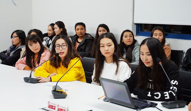 2014级布丽德尔青、古丽米热和美合日阿依于今年5月至8月赴美国杜肯大学访学,她们向在场的同学讲述了那里有趣的教授以及活跃同时严谨的课堂学习氛围。她们说,在杜肯大学的访学是近乎完美的,虽然会有这样那样的困难,但是收获是远远大于困难的。现在回到了国内也是全身心投入到专业的学习中。听了她们故事,看了她们制作的精美视频,很多同学在羡慕之余也在心里想要向她们学习。最后2014级罕柯孜同学分享了大学这几年她在校内校外做志愿者的经历,她把当志愿者过程当做一种学习。
