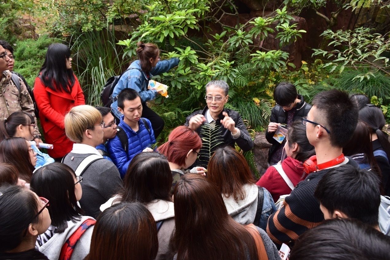 寓教于乐能够进一步促进同学们对知识的吸收,扬帆团的赵志礼教授是生药学研究的专家,他长期致力于各种药用植物的研究,以最生动的方式给学生讲解药用植物的各种知识,他最喜爱的教学方式就是带领学生深入自然,深入药植生长地,以大自然为课堂向同学们传授草药传奇。来到药植园,赵老师首先讲述了关于药用植物的基本知识,从单细胞到多细胞,裸子植物到被子植物等等的进化……药用植物的性状、形态、科目属、特性效用等都是最能抓住学生兴趣点的知识,赵老师细致的讲解和分析,让同学们对植物有了基本的认识。随后,赵老师带领着大家一边参观一边结合身边的药用植物进行讲解。