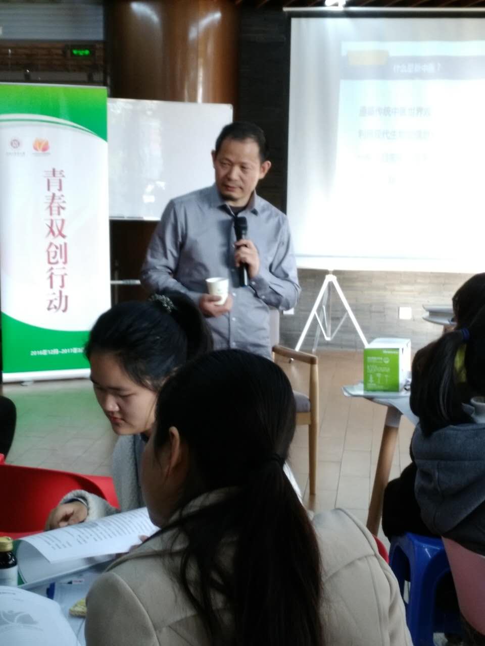 12月10日下午,我校第二届大学生创新学堂第三讲在学生事务与发展中心一楼顺利开讲。本次创新学堂第三讲由团委副书记吴平老师主持。证大集团、九间堂创始人戴志康先生给大家带来了一场“新中医、新体系”的精彩讲课,戴志康先生在讲课中,不断提出新颖的“草与乐”,“人体的频率”等理论,并就这些理论与学员们展开了激烈的讨论,与学生碰撞出了不少的创新的火花,其理论新奇,富有创新意义。让我们的学员发现创新可以如此大胆,如此奔放,更加坚定了学员为中医药的发展,走好创新之路的信心。